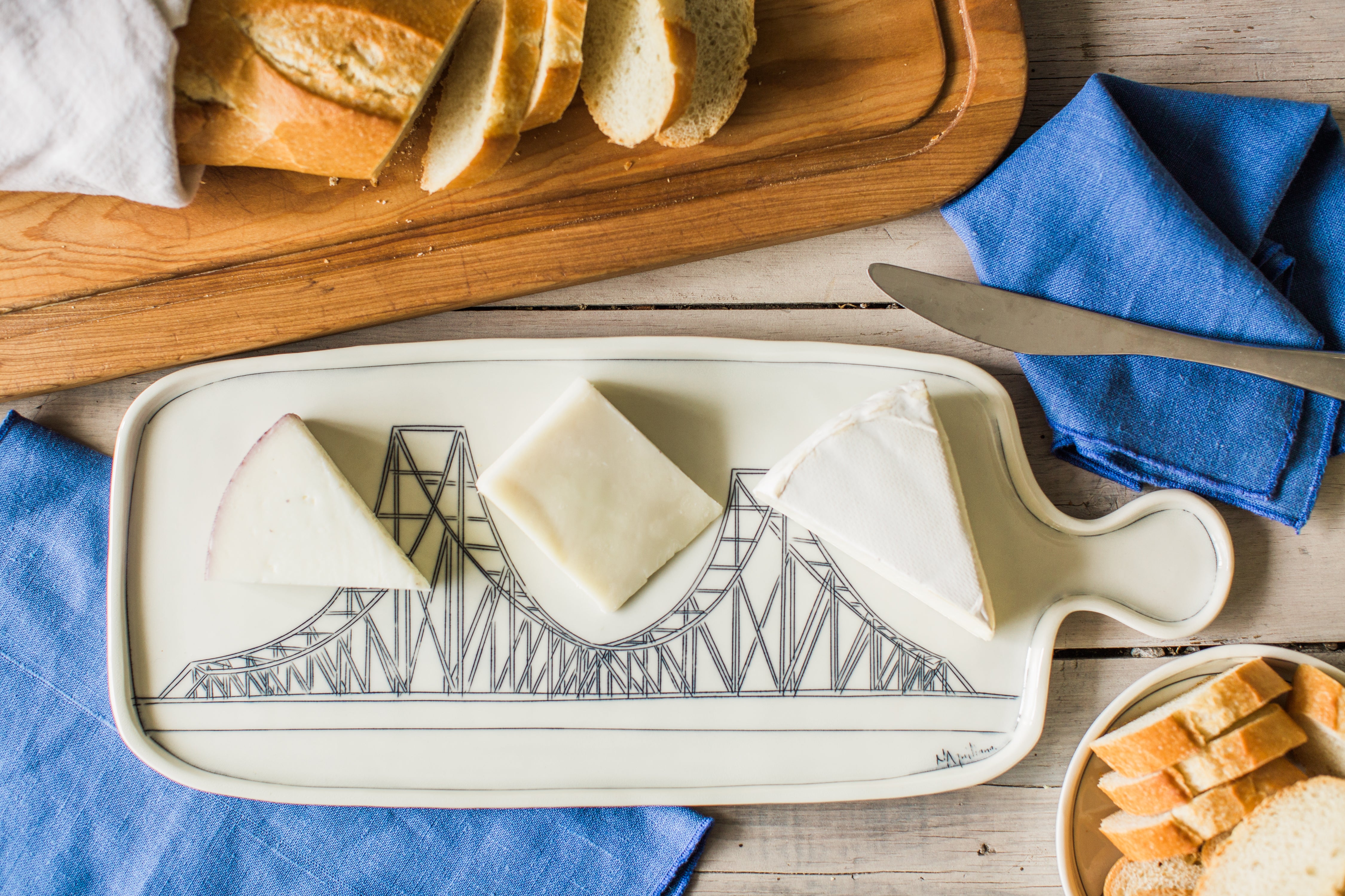 Each image is hand drawn directly into the porcelain clay with a knife, and the etching is inlaid with a dark underglaze. The high temperature of the kiln combined with a clear glaze overlay slightly blurs the drawing, much like a faded memory. Each piece is a one-of-a-kind work of art reminiscent of the places and experiences that define and connect us all.