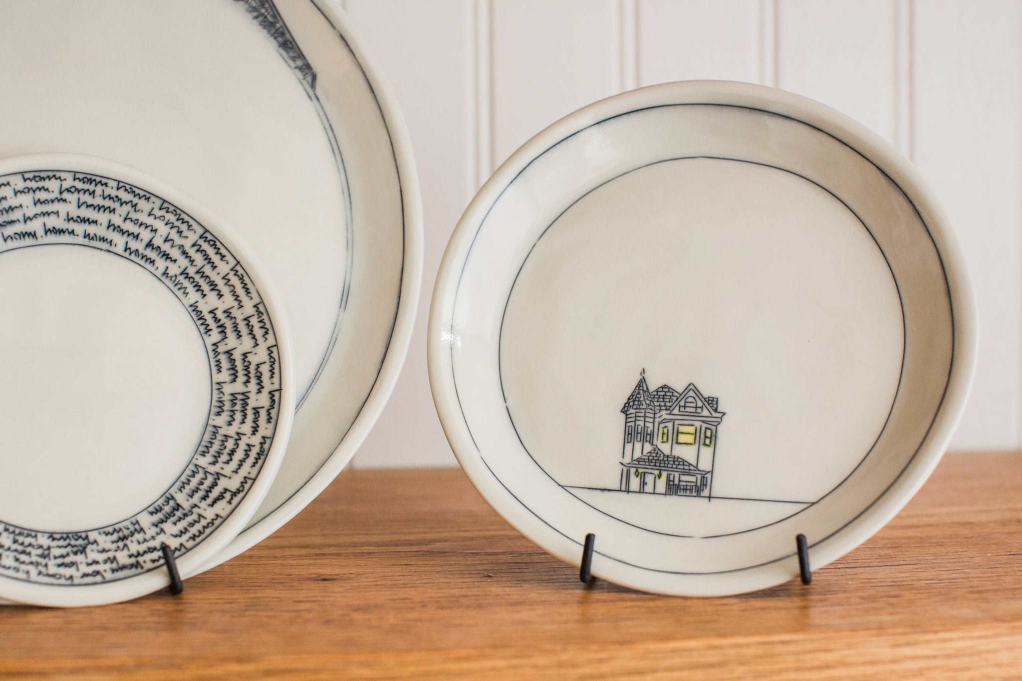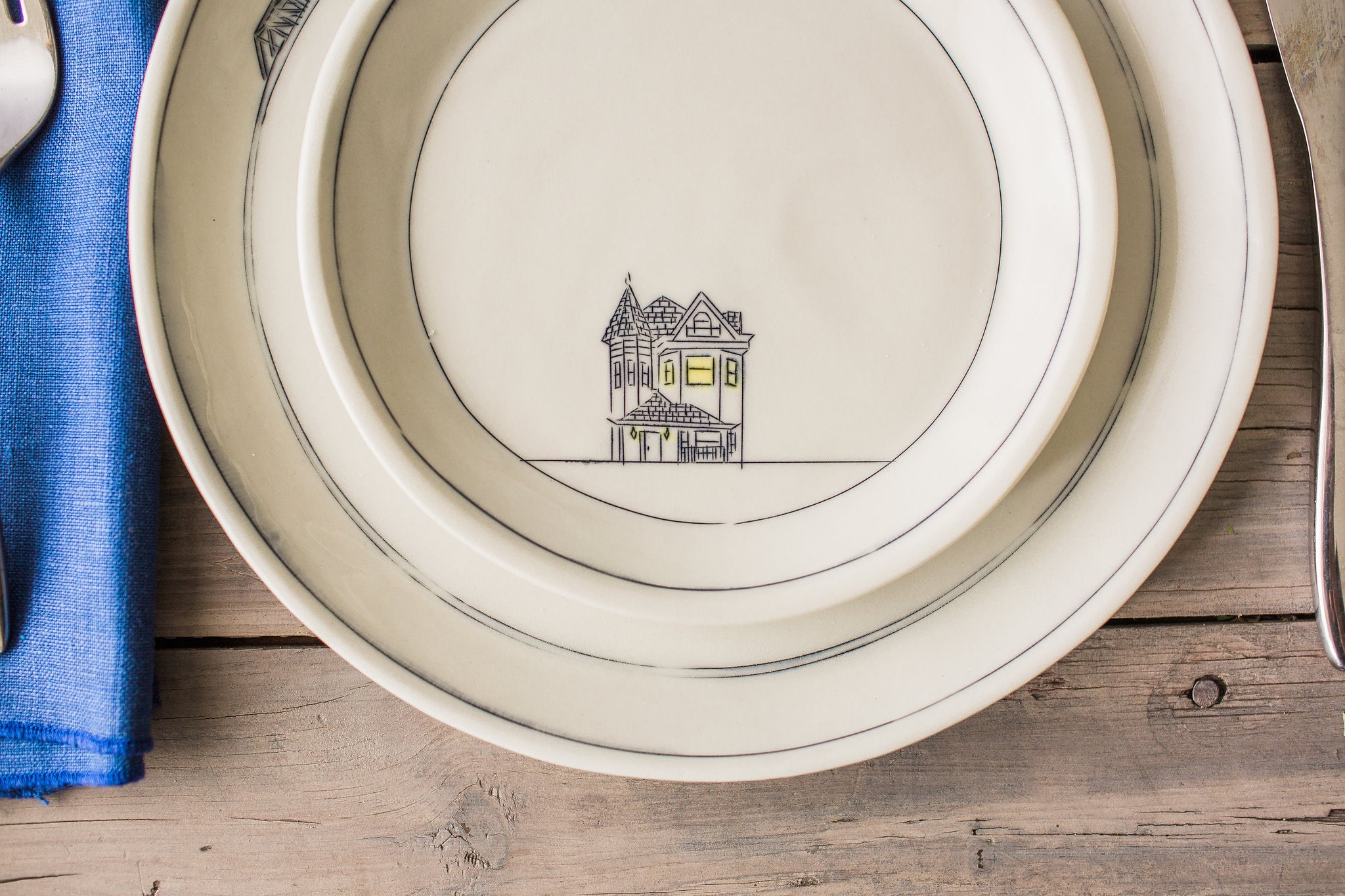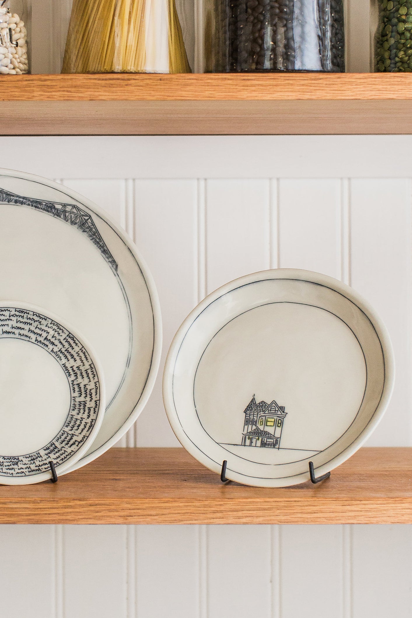 Choose your favorite images to create a collection of plates reminiscent of your own personal narrative! Each image is hand drawn directly into the porcelain clay with a knife, and the etching is inlaid with a dark underglaze. The high temperature of the kiln combined with a clear glaze overlay slightly blurs the drawing, much like a faded memory. Each piece is a one-of-a-kind work of art reminiscent of the places and experiences that define and connect us all.