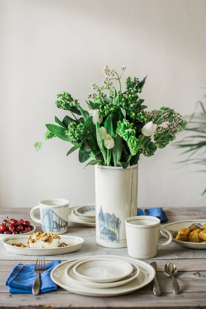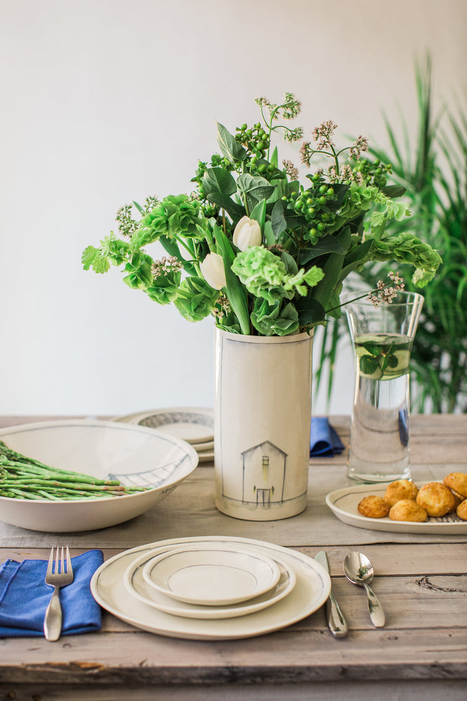 Choose your favorite images to create a collection of vases reminiscent of your own personal narrative. Each image is hand drawn directly into the porcelain clay with a knife, and the etching is inlaid with a dark underglaze. The high temperature of the kiln combined with a clear glaze overlay slightly blurs the drawing, much like a faded memory. Each piece is a one-of-a-kind work of art reminiscent of the places and experiences that define and connect us all.