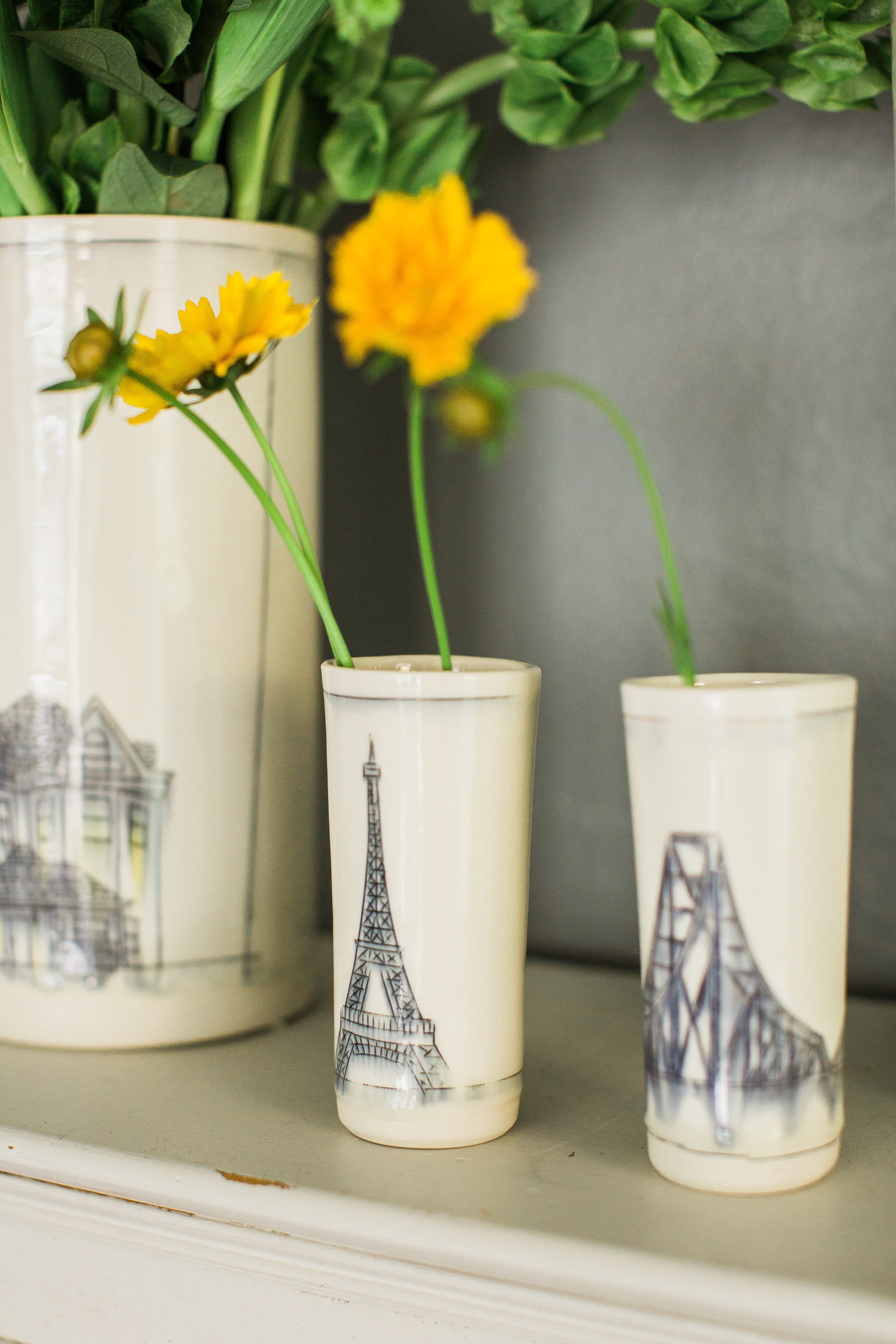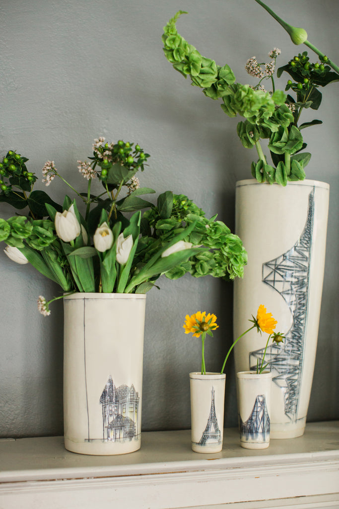 Choose your favorite images to create a collection of vases reminiscent of your own personal narrative. Each image is hand drawn directly into the porcelain clay with a knife, and the etching is inlaid with a dark underglaze. The high temperature of the kiln combined with a clear glaze overlay slightly blurs the drawing, much like a faded memory. Each piece is a one-of-a-kind work of art reminiscent of the places and experiences that define and connect us all.