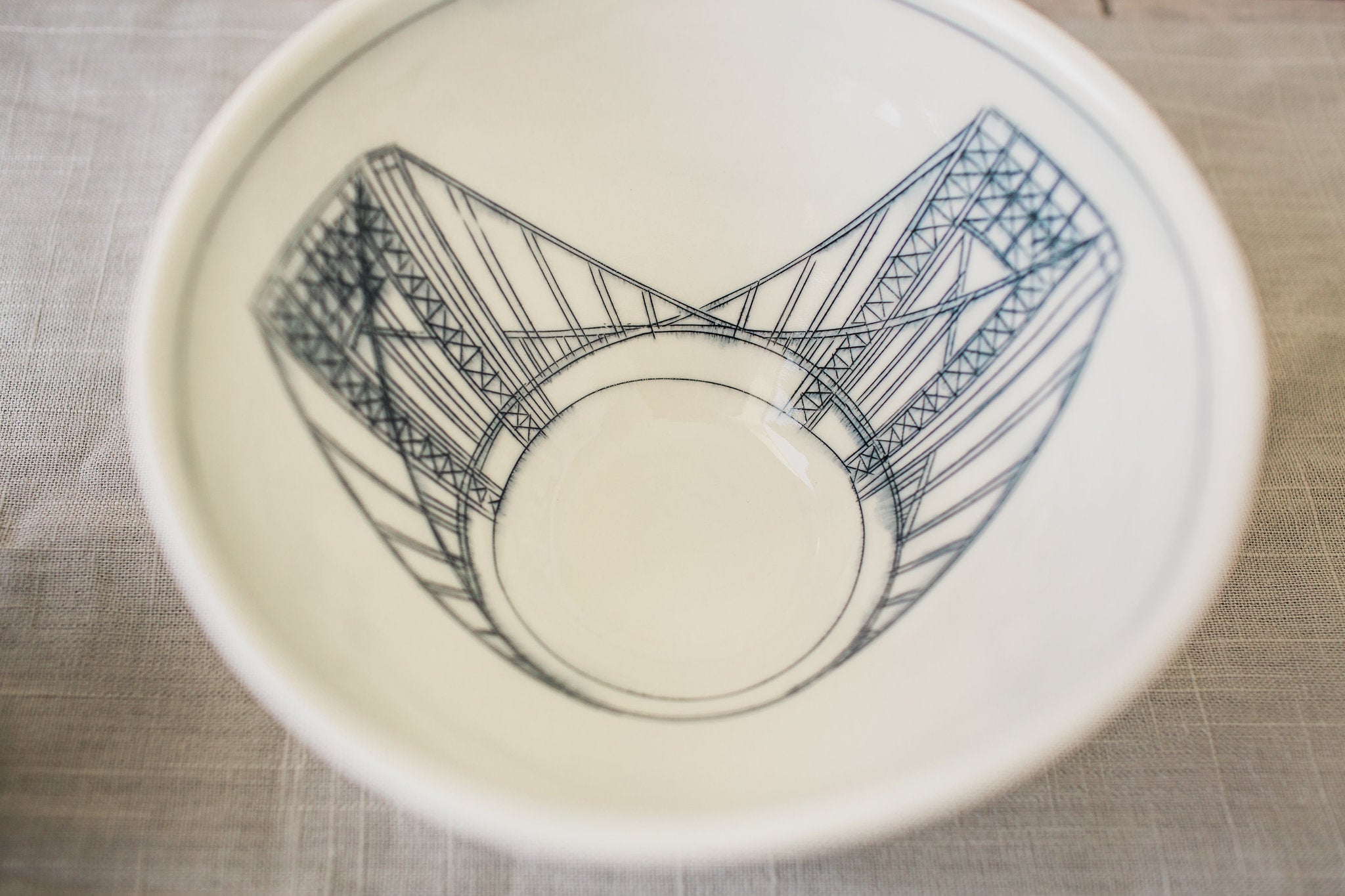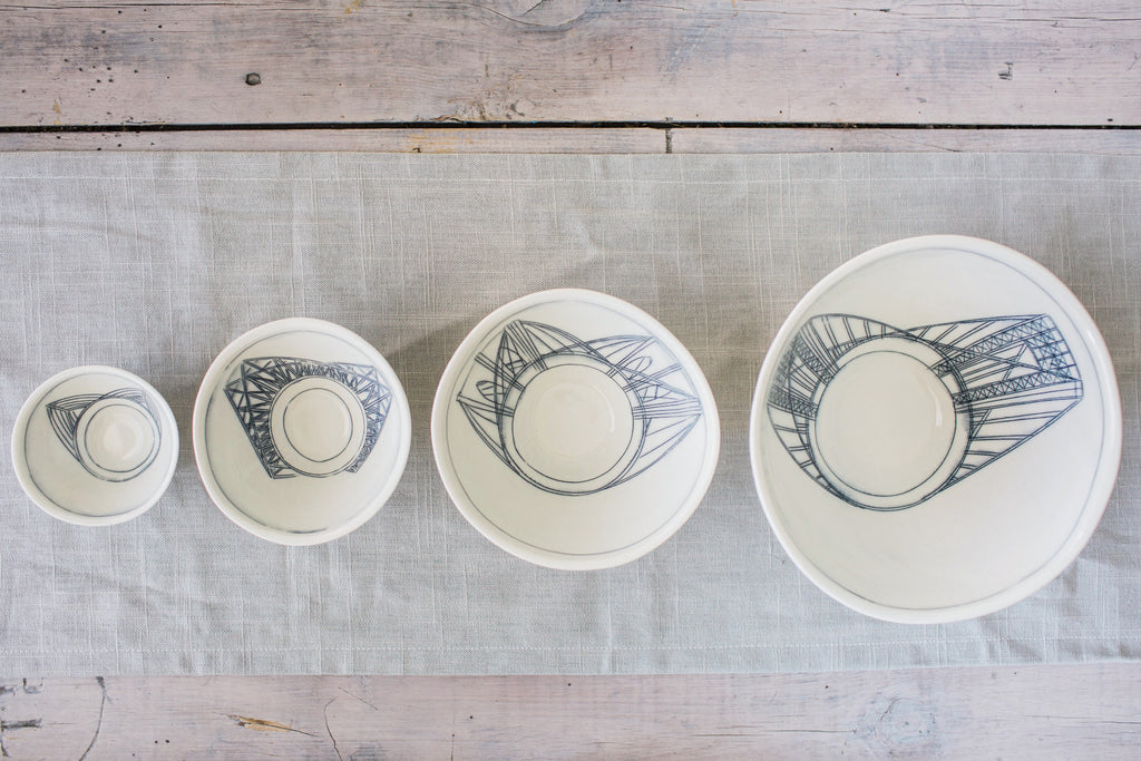 Choose your favorite images to create a collection of bowls reminiscent of your own personal narrative. Each image is hand drawn directly into the porcelain clay with a knife, and the etching is inlaid with a dark underglaze. The high temperature of the kiln combined with a clear glaze overlay slightly blurs the drawing, much like a faded memory. Each piece is a one-of-a-kind work of art reminiscent of the places and experiences that define and connect us all.