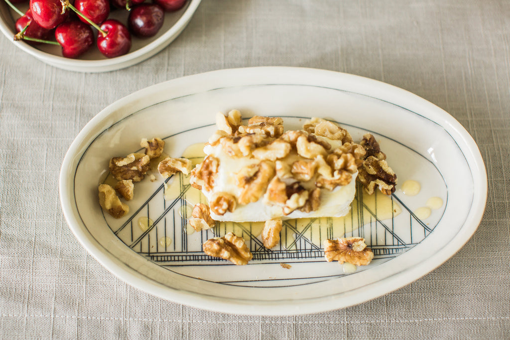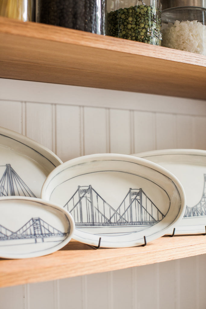 Choose your favorite images to create a collection of ovals reminiscent of your own personal narrative. Each image is hand drawn directly into the porcelain clay with a knife, and the etching is inlaid with a dark underglaze. The high temperature of the kiln combined with a clear glaze overlay slightly blurs the drawing, much like a faded memory. Each piece is a one-of-a-kind work of art reminiscent of the places and experiences that define and connect us all.