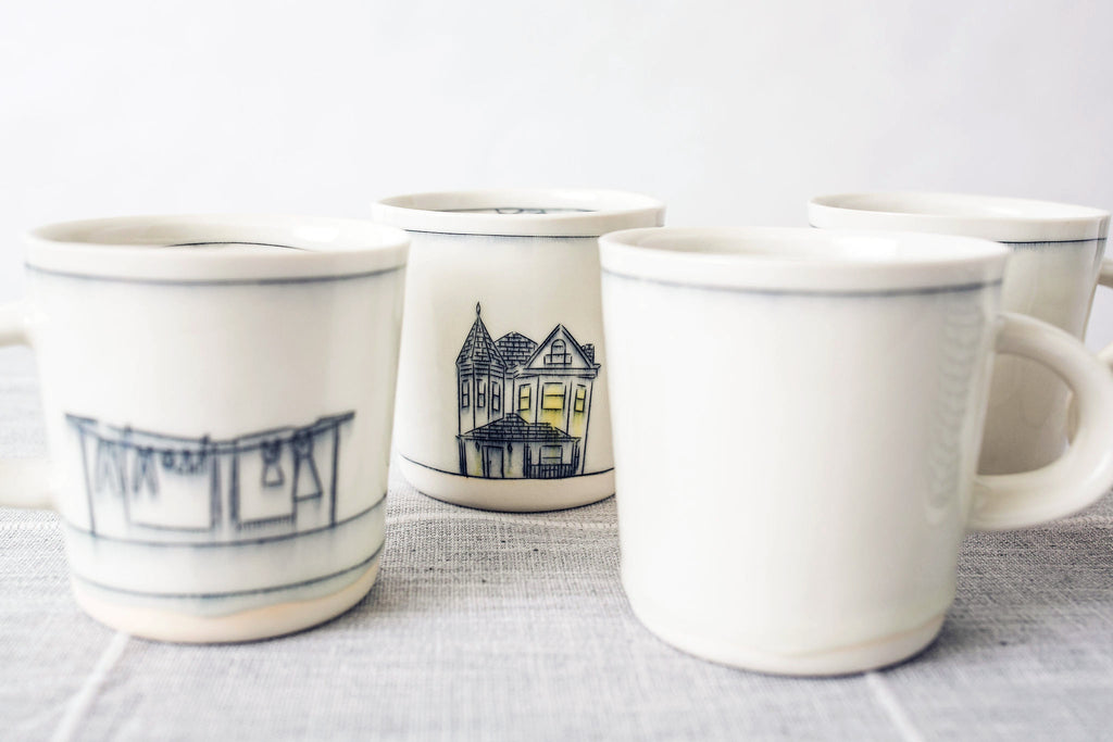 Choose your favorite images to create a collection of mugs reminiscent of your own personal narrative! Each image is hand drawn directly into the porcelain clay with a knife, and the etching is inlaid with a dark underglaze. The high temperature of the kiln combined with a clear glaze overlay slightly blurs the drawing, much like a faded memory. Each piece is a one-of-a-kind work of art reminiscent of the places and experiences that define and connect us all.