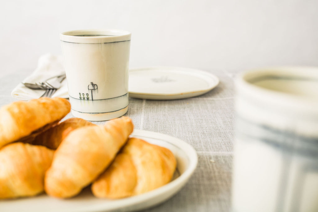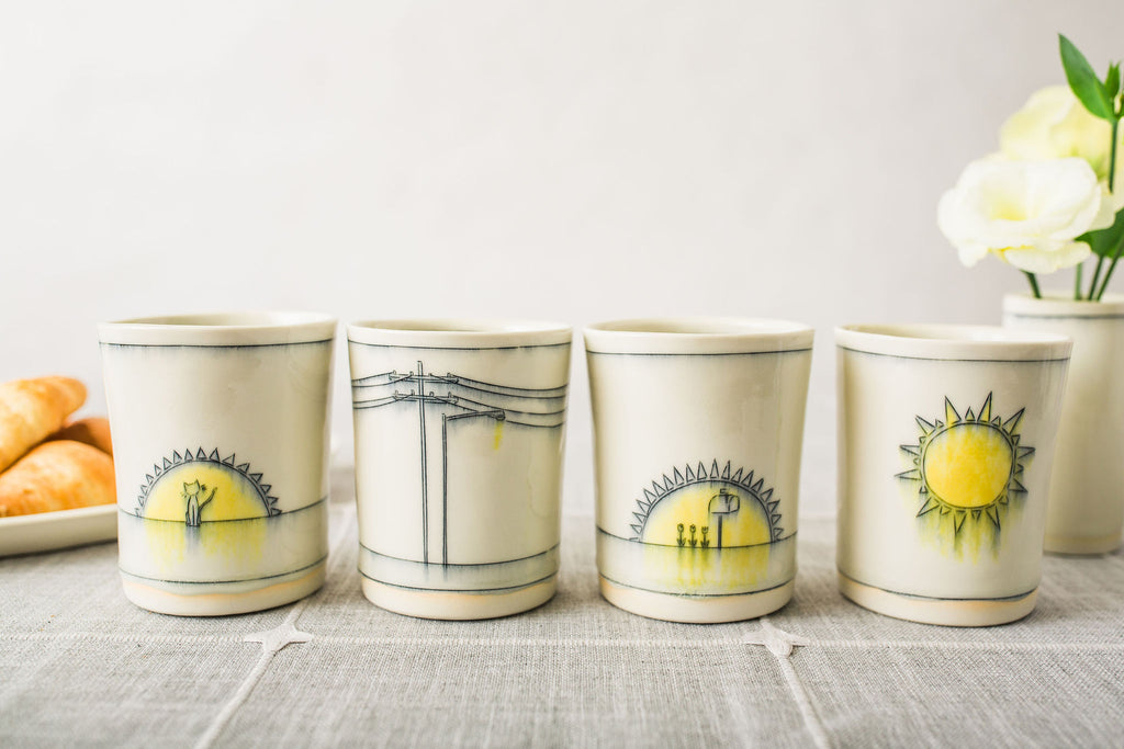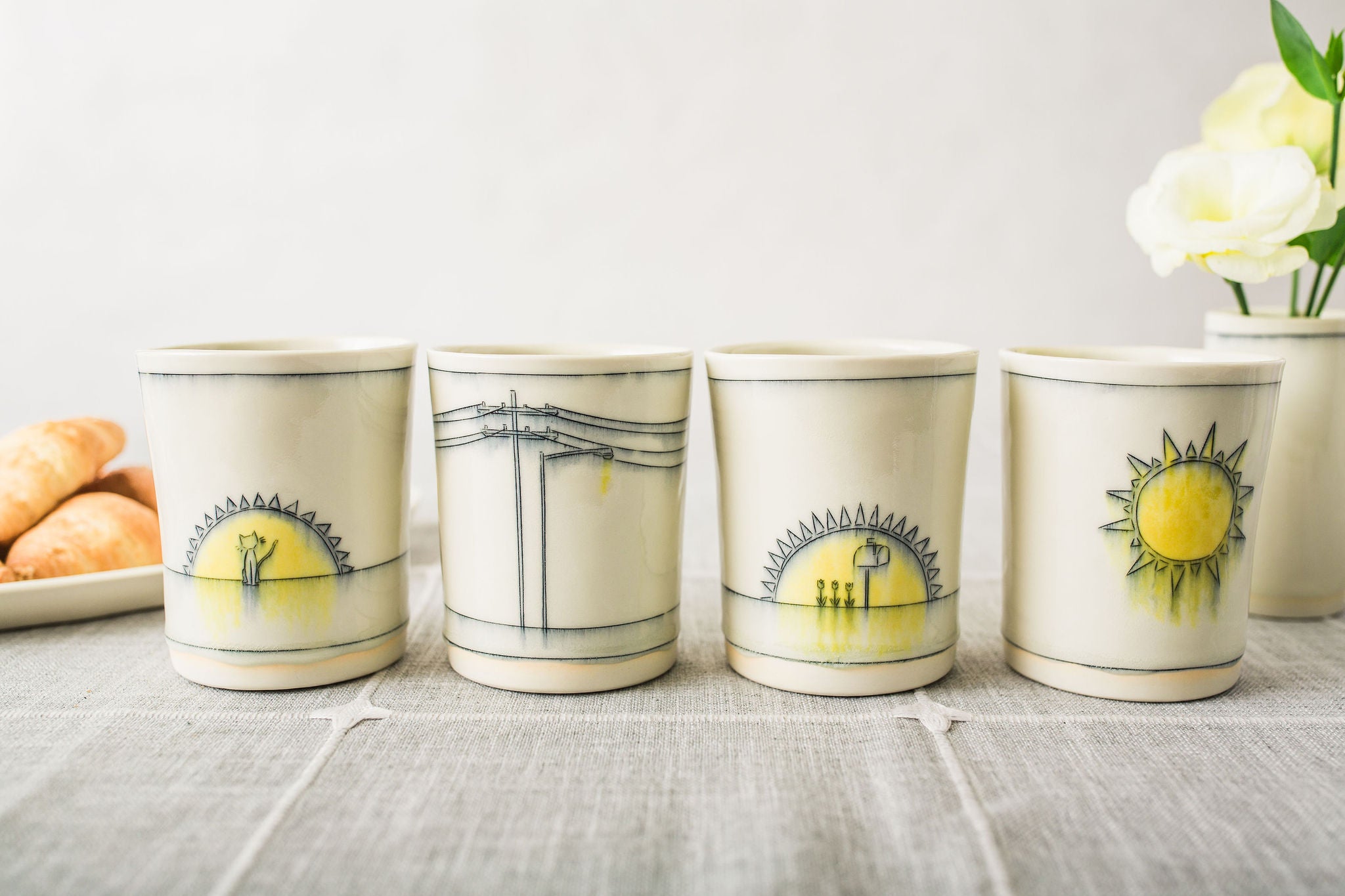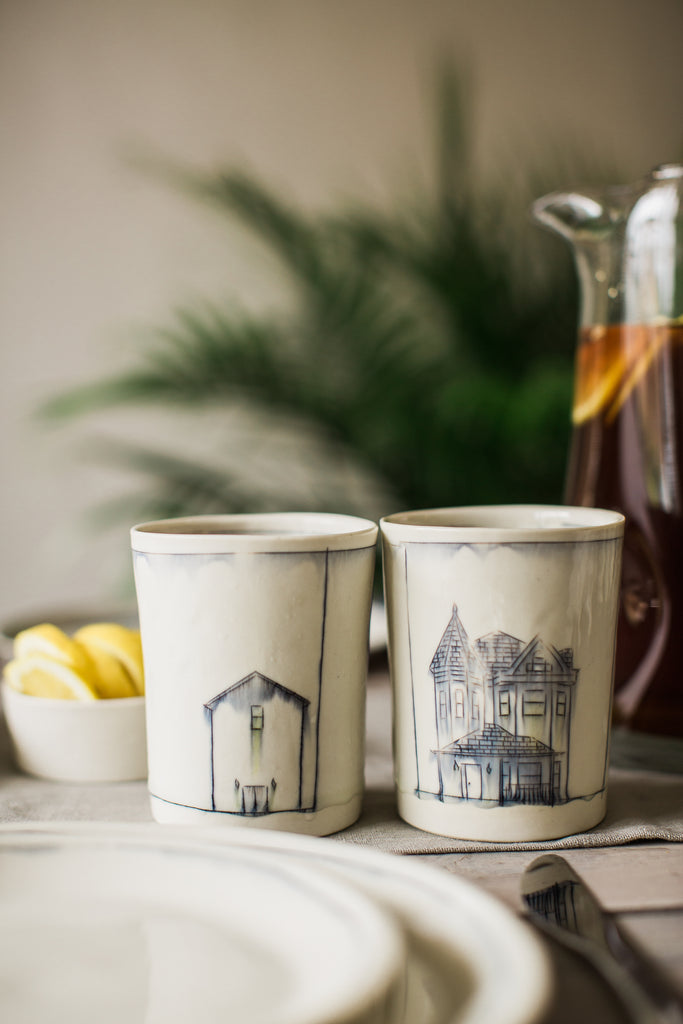Choose your favorite images to create a collection of tumblers reminiscent of your own personal narrative! Each image is hand drawn directly into the porcelain clay with a knife, and the etching is inlaid with a dark underglaze. The high temperature of the kiln combined with a clear glaze overlay slightly blurs the drawing, much like a faded memory. Each piece is a one-of-a-kind work of art reminiscent of the places and experiences that define and connect us all.