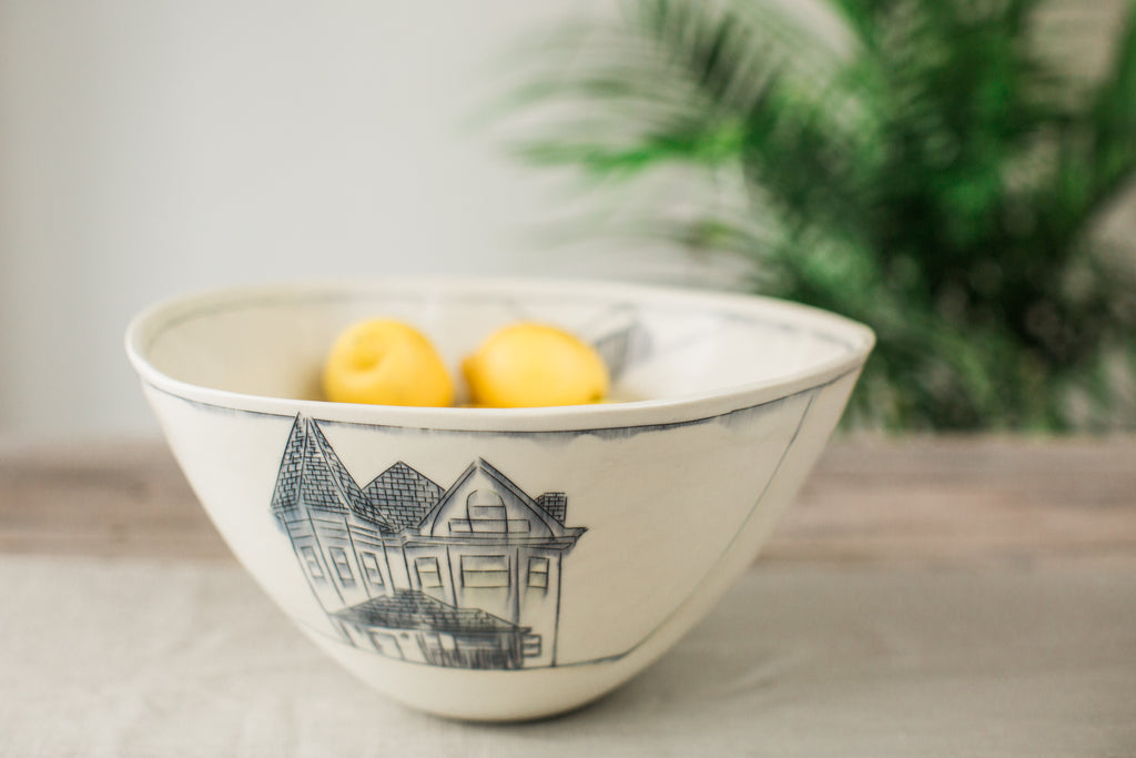 Each image is hand drawn directly into the porcelain clay with a knife, and the etching is inlaid with a dark underglaze. The high temperature of the kiln combined with a clear glaze overlay slightly blurs the drawing, much like a faded memory. Each piece is a one-of-a-kind work of art reminiscent of the places and experiences that define and connect us all.